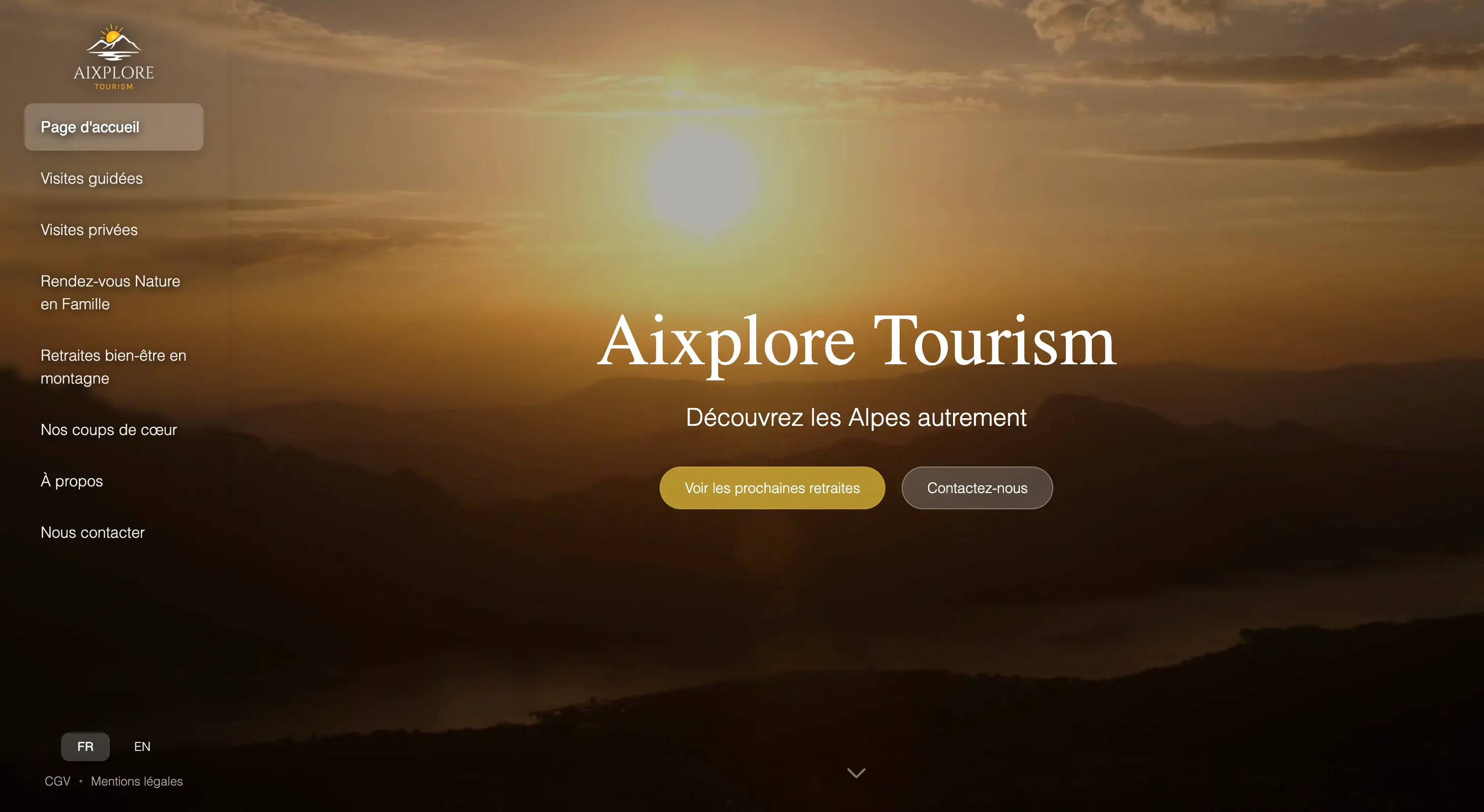 Site vitrine bilingue (FR/EN) pour une agence de tourisme alpin proposant visites guidées, retraites bien-être en montagne et activités nature en famille dans les Alpes françaises. Interface d'administration sur mesure pour la gestion autonome des contenus et des expériences.